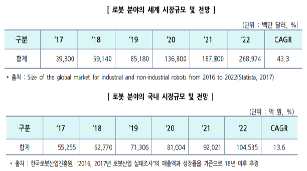 - 세계 로봇 시장 규모는 2017년 398억 달러에서 연평균 43.3 %씩 증가하여 2022년 2,690억 달러에 도달할 전망.