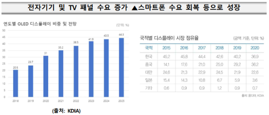 - OLED 디스플레이 비중 전망은 2018년 20.5%에서 2025년 44.3%까지 확대될 것으로 예상