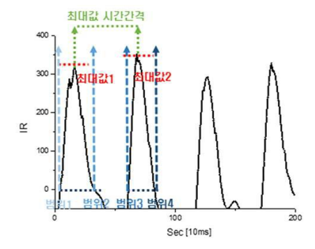- 본 발명은 굴곡 그래프의 볼록한 부분의 최대값을 구하여 각각의 최대값의 시간 간격을 평균하여 분당 심박수를 구하는 방식임.