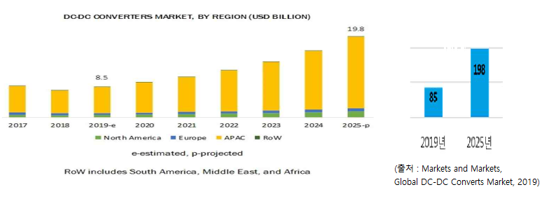 - 세계 DC-DC 컨버터 시장규모는 2019년 85억 달러에서 2025년 198억 달러로 연평균 15.1 % 성장할 것으로 전망됨.